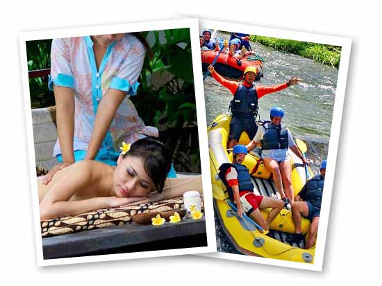 Rafting and Spa Tour is an Bali Double Activities Tour Packages we made for your joyment and will make your holiday more memorable one, by give you opportunity to try the challenge rapids at Ayung river and then continue for having Spa treatmants packages in Bali islands. This is the best choices of combo adventure packages, Firstly you will enjoy ride the floating tube to test the rapids challenge of Ayung River, the professional River Rafting Guide will give some short briefing about the safety and how to paddle in the river. During the rafting the rafting guide will dtop the boat and give you change to swim at the river and see the fascinating small waterfall at the river. After finish the rafting you will escorted back to the finish point for enjoy the delicious lunch buffet with Indonesian food and then after finish lunch our professional Bali Tour Driver will driver you to the Spa provider to enjoy the 2 hours spa treatmants, the spa treatmants we offer consist of 1 hours balinese massage and 1 hours spa treatmants.