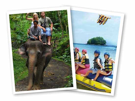 Water Sports and Elephant Ride Tour is an Bali Double Activities Tour Packages to try two famous activities in one day, first you will enjoy the water sports activity and then continue to riding an elephant in Bali islands. Is great combo adventure we created in to single tour packages by allowed you and your family to try our selection Water Sports activity such as : Banana Boat, Flying Fish, Glass Bottom Boat and Turtle Islands Tour in the best beach. You will assist by our professional Water Sports instructor. The Water sports and elephant ride tour more enjoyable with our Golden Bali Tour Driver by perform an excellent tour services with Private Car. After finish the adventure of water sports, we will directly go to elephant park, before ride the elephant you will enjoy the lunch buffet Indonesian food first, After lunch we will continue your adventure by give you opportunity to riding the biggest animal through the jungle and passed the local village to see the social activities life in this village in the top of the elephants with duration 30 minutes ride.
